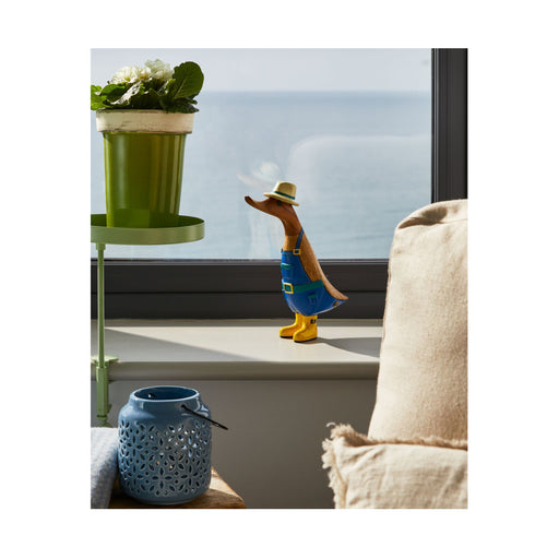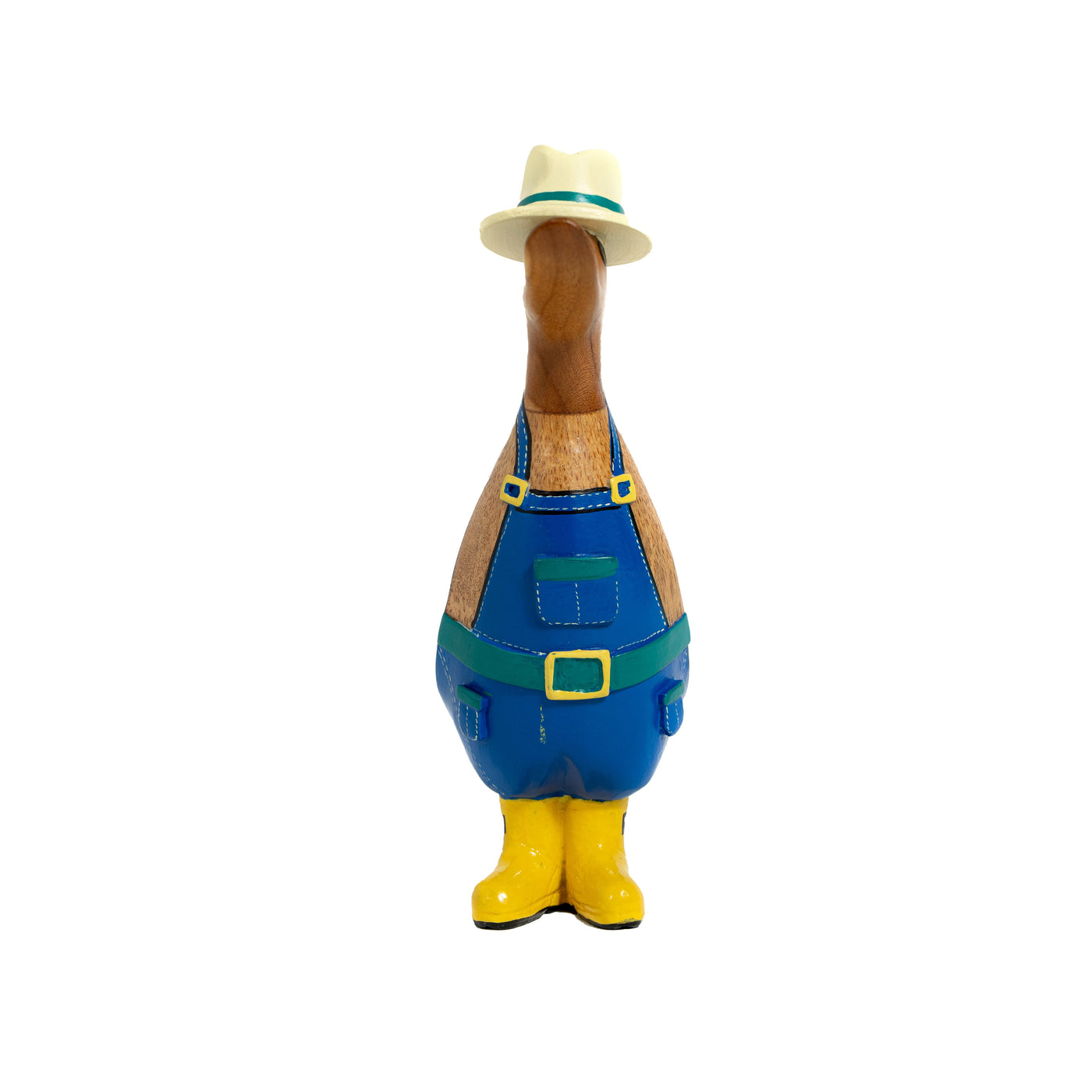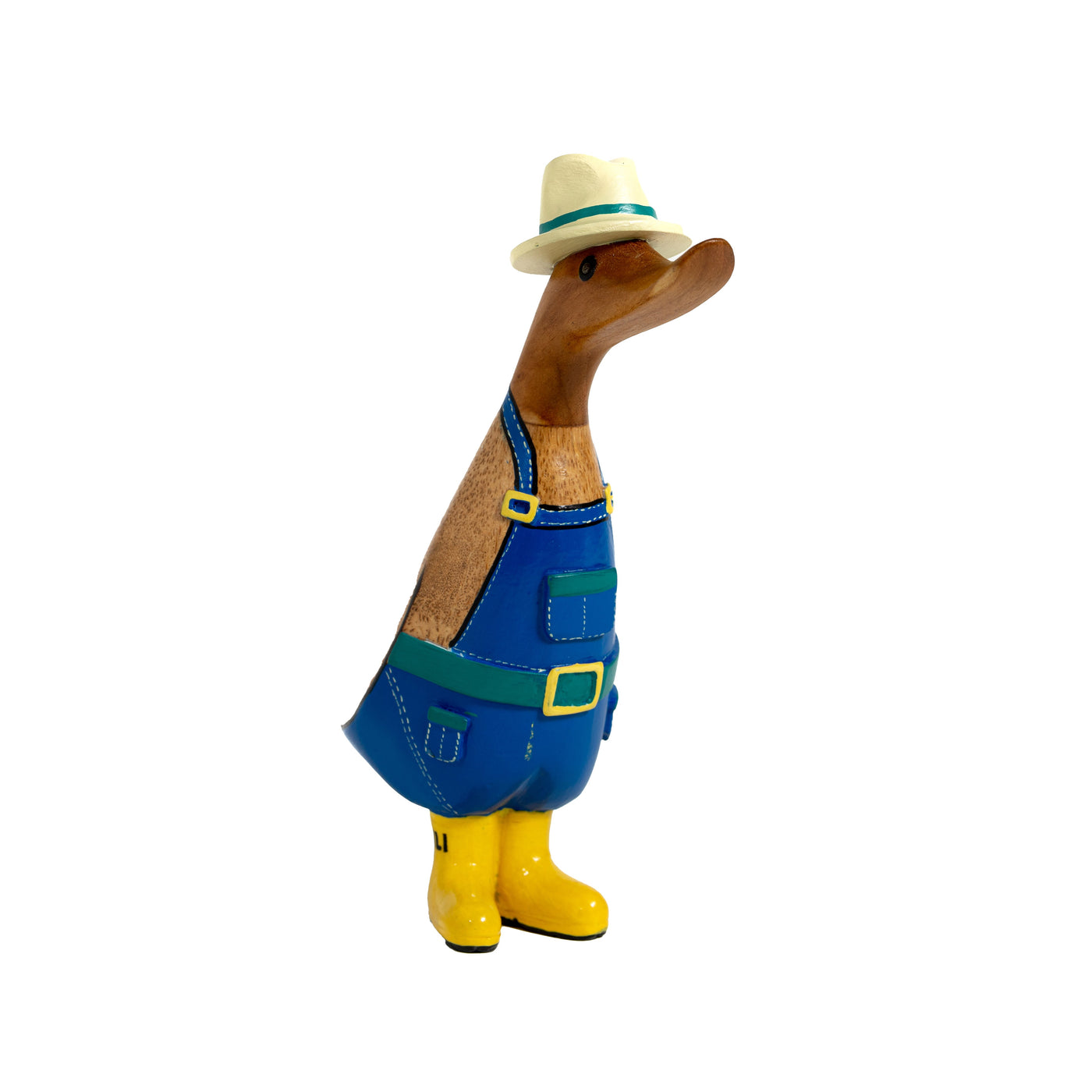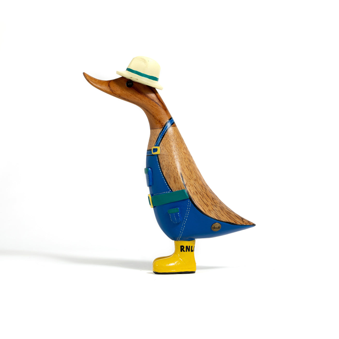 In a straw hat, denim dungarees and a pair of RNLI yellow wellies, this hand-crafted wooden duck is ready to tackle the garden!