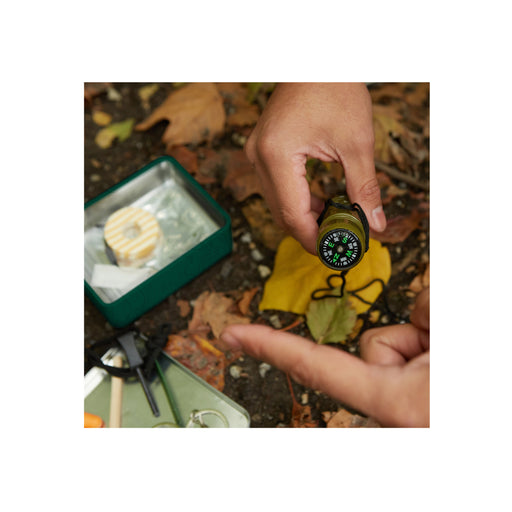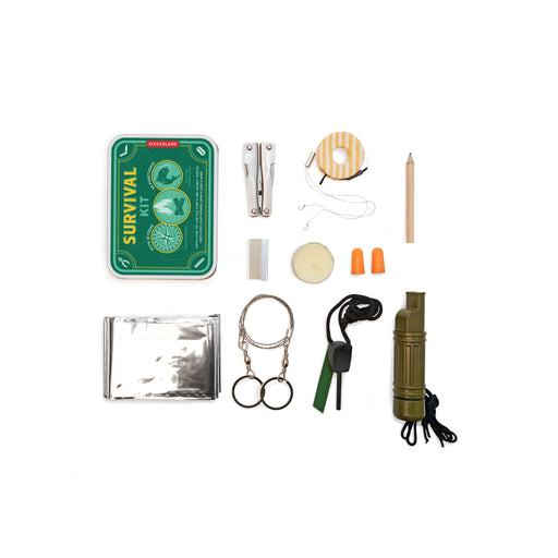 The kit includes: emergency blanket, wire hand saw, 5-in-1 whistle, earplugs, pencil, candle, flint & striker, razor blade, multi function knife, fish hook, line & bait.
