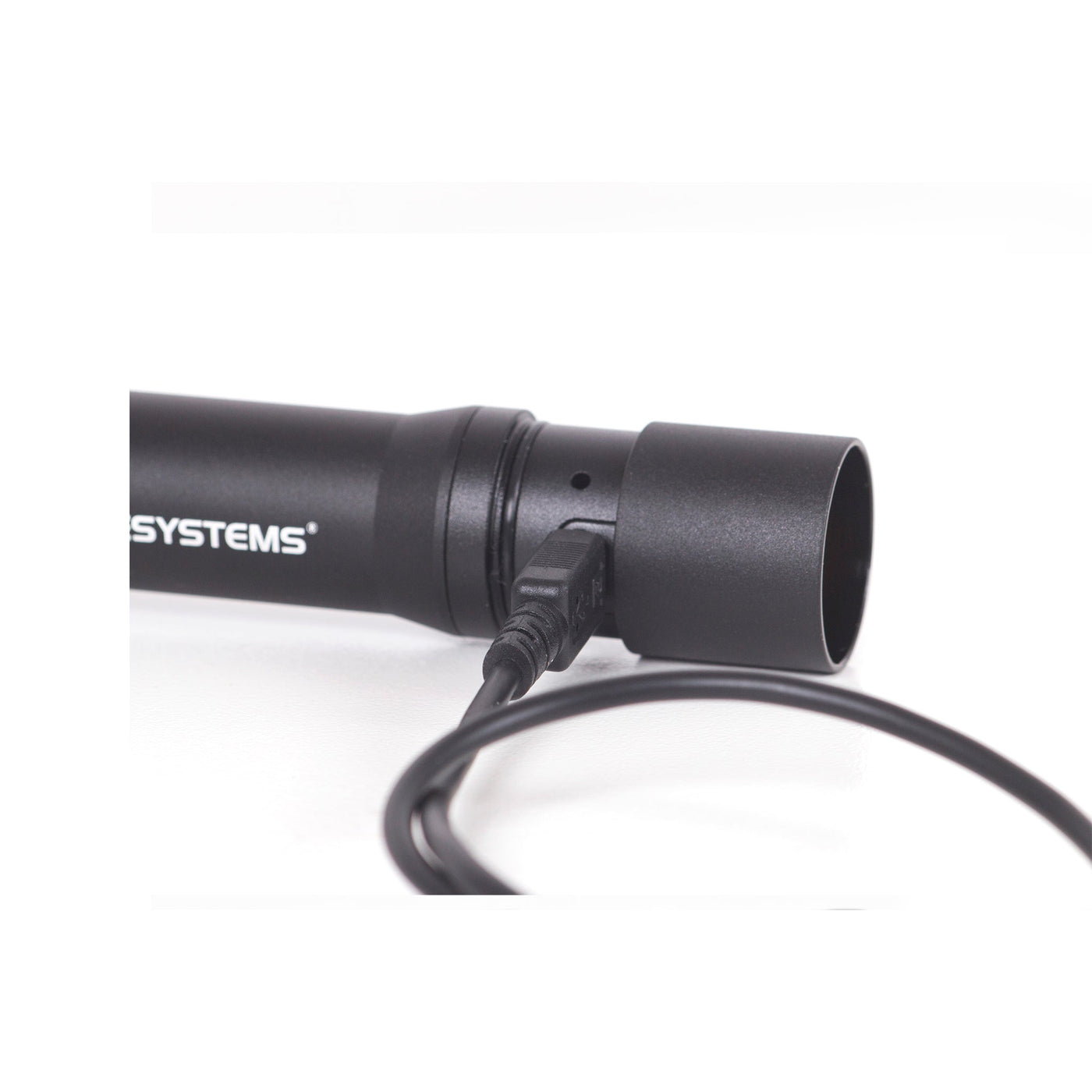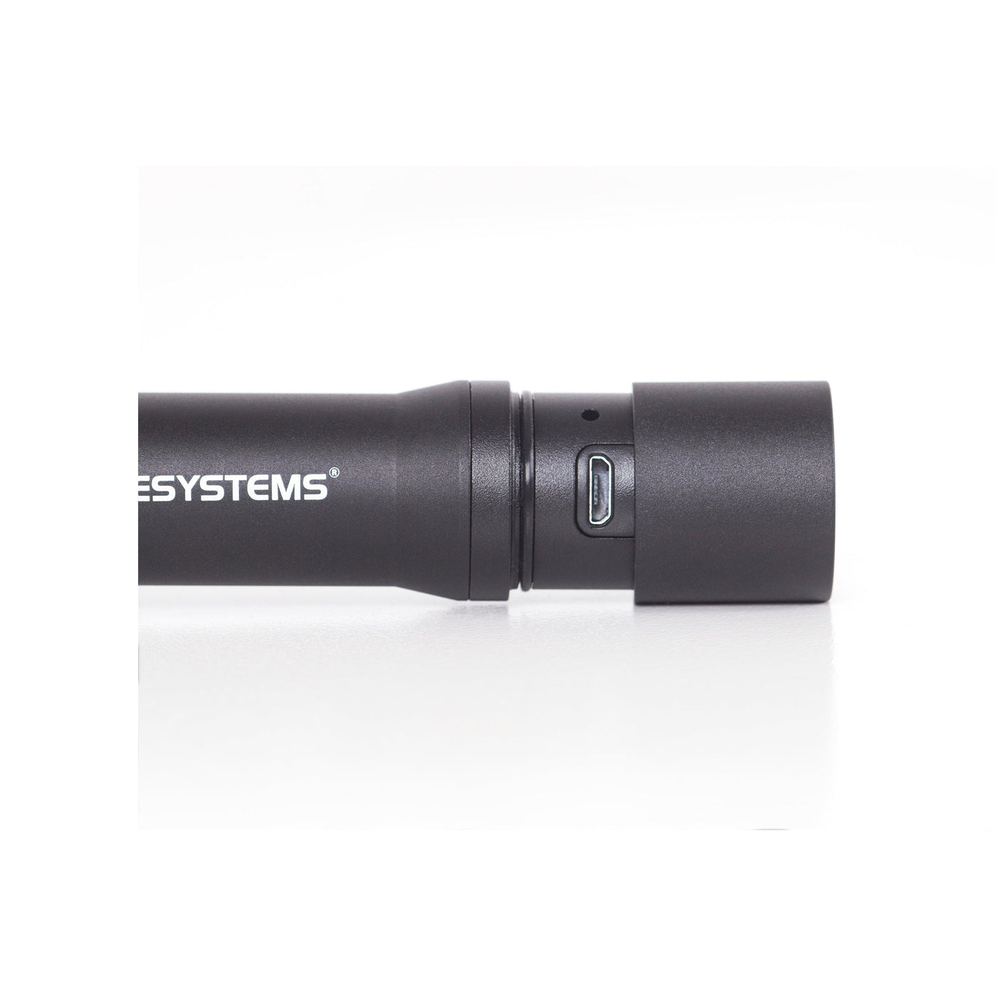 This torch uses Nichia LEDs that deliver a clinical white light in low, medium, high and Turbo settings. Charging is easy, slide the cover back to reveal micro-USB port.