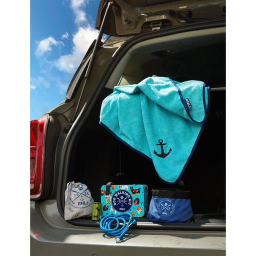 The blue dog towel has an embroidered anchor and edging, giving it a fresh nautical feel.