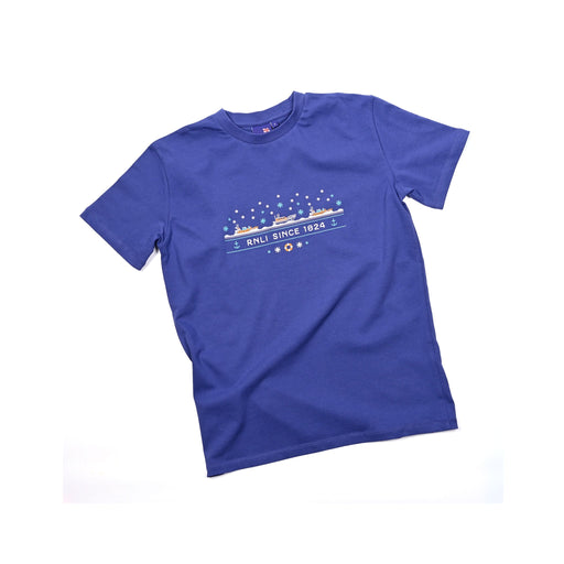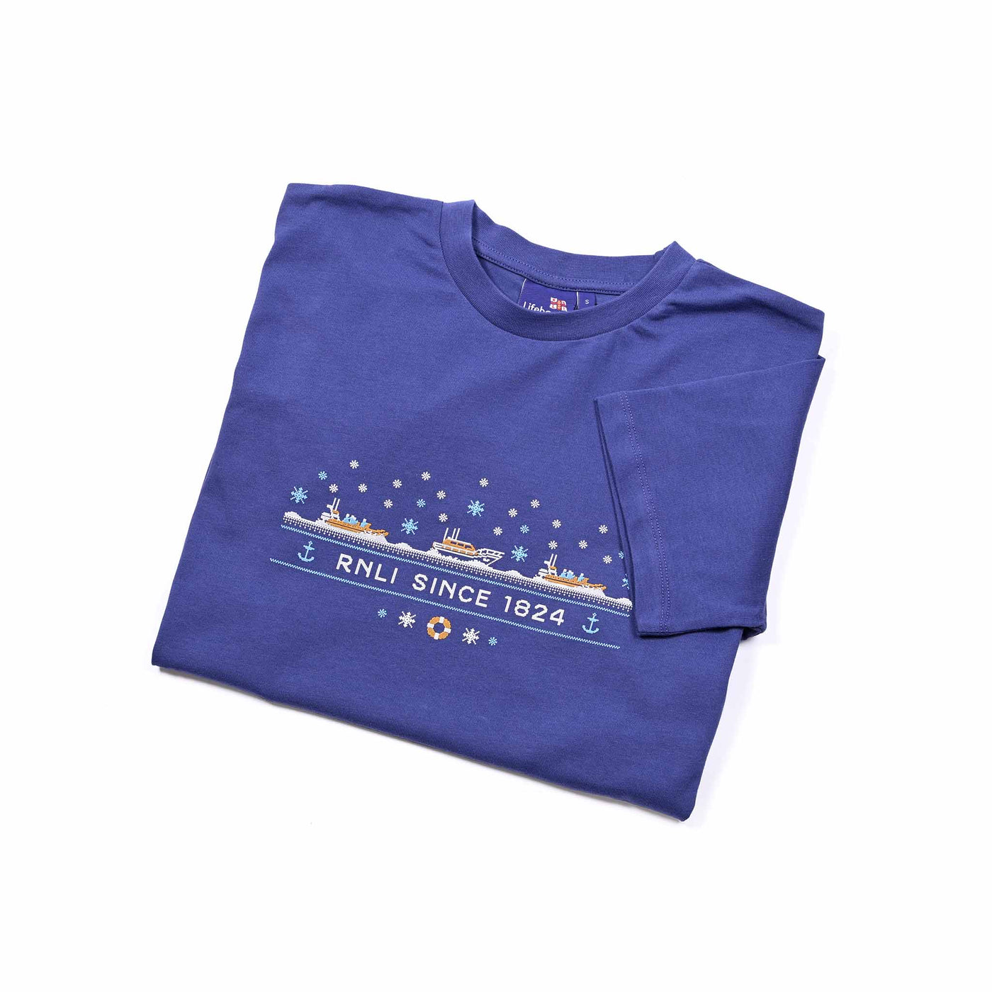 This soft blue Christmas T-shirt features an RNLI Since 1824 screen print on the chest, with snowy lifeboats and nautical icons for a seasonal twist.