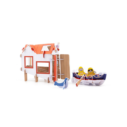 Our fully recyclable press and play lifeboat station set will spark their imagination! Pop out all the pieces and build your very own traditional lifeboat station complete with an old rowing lifeboat. Launch the heritage lifeboat to the rescue and row through stormy seas to save every one.