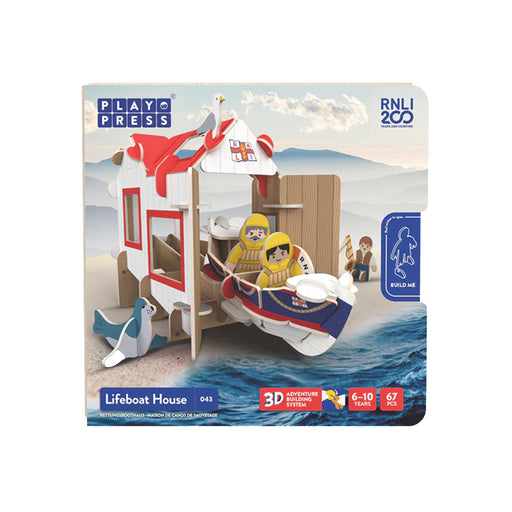 This set contains 2 RNLI crew members, a seal, a fisherman, and a heritage RNLI lifeboat and boathouse to build and play with.
