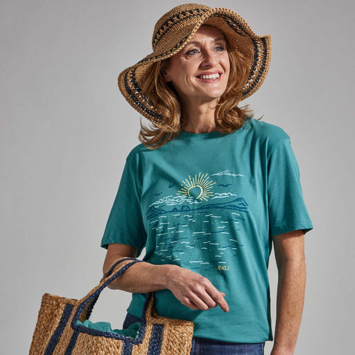 In a teal blue and featuring a coastal scene printed on the front, this T-shirt will be your new best friend for adventures by the water.