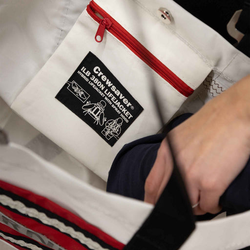 Please note: Each bag is unique and may vary slightly from the image shown due to the process of selecting the best of the repurposed materials, which are expertly cut, assembled and stitched by hand to make the product. Sailcloth may feature details such as zigzag stitching, grommets and other features from the original sail design. Fabric, webbing, trims and metal hardware from the repurposed lifejackets may also vary, depending on the specification of the kit.