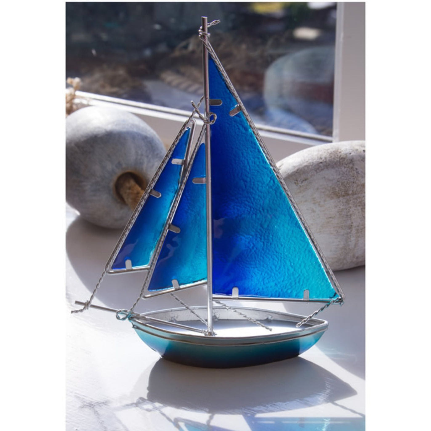 Our handmade, stained glass yacht from Nauticalia is the perfect finishing touch for your window ledge or desk. The gently curved sails capture the light where they will glow and shimmer throughout the day.