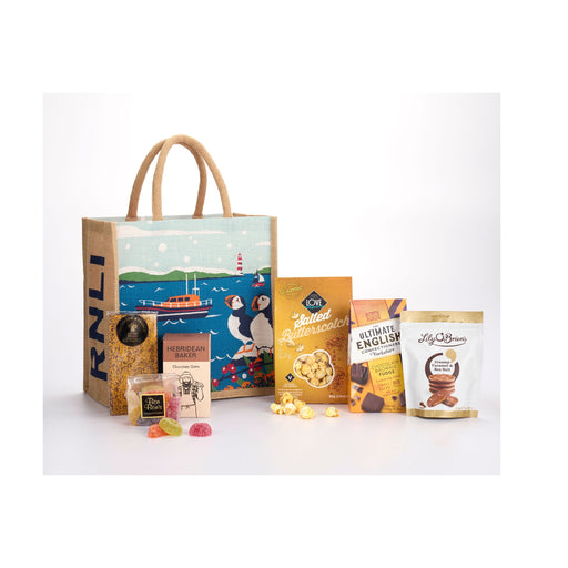 From irresistible chunks of chocolate brownie fudge to luxury fruit jellies, this hamper is full of sweet treats. And best of all, they’re packed inside an equally sweet RNLI Winter Puffins in Harbour Jute Gift Bag.