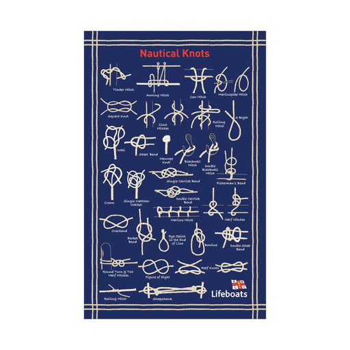 This cotton kitchen tea towel is a clean, modern spin on a classic RNLI design. It features a bold, colourful design, showing some of the classic nautical knots for seafarers.